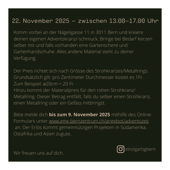 Am 22. November von 13:00 - 17:00 organisieren wir vom Team einzigARTig einen Anlass zum kreieren eines Adventskranzes oder Adventsschmucks.